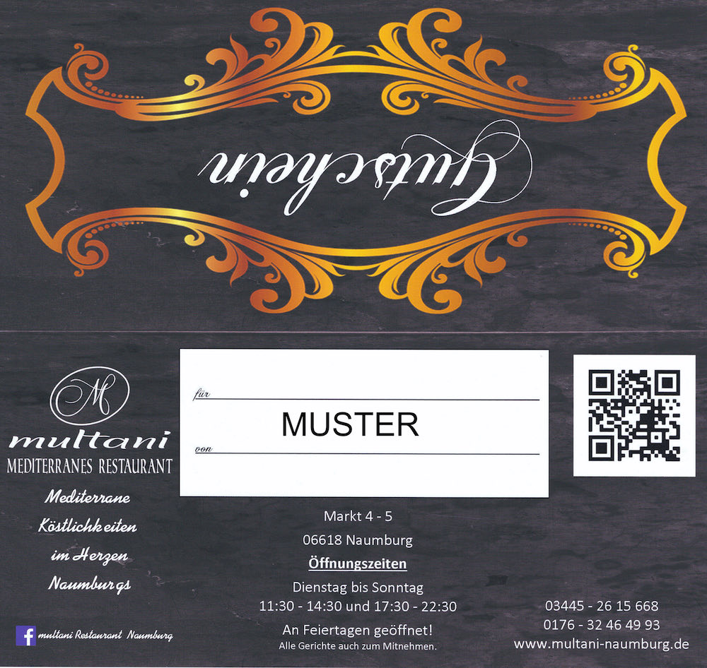 Sie können unseren Geschenkegutschein, per Bestellformular bestellen oder direkt im Restaurant Multani erhalten. Für weitere Fragen stehen wir Ihnen telefonisch oder per E-Mail zur Verfügung.